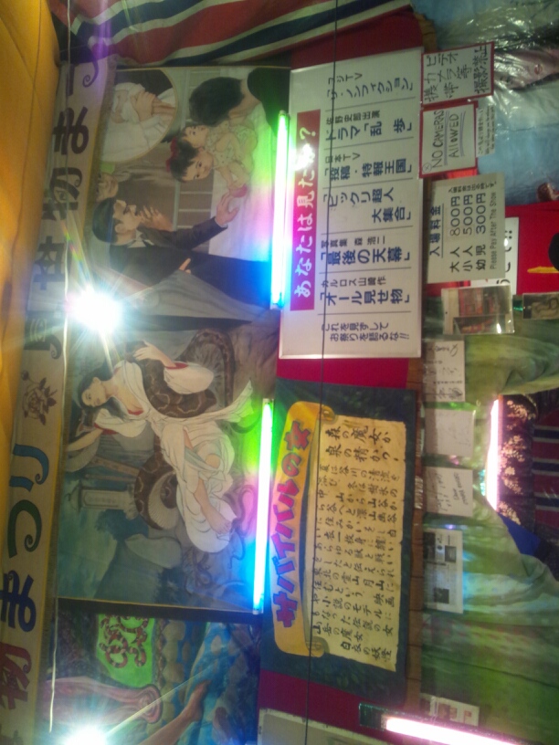 見世物小屋とは、早い話がサーカスみたいなもので、ビックリ人間が出てくるショーみたいな?わたしも詳しくは解りませんでした